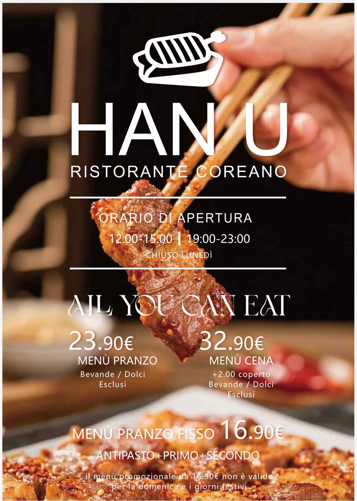 Il nostro All You Can Eat coreano è pensato per chi vuole scoprire senza limiti i sapori autentici della Corea. Da Han U puoi gustare una selezione di carni, verdure e specialità tradizionali, tutte da cucinare al tavolo sulla piastra integrata. È la formula ideale per condividere, assaggiare e vivere appieno l’esperienza del Korean BBQ.